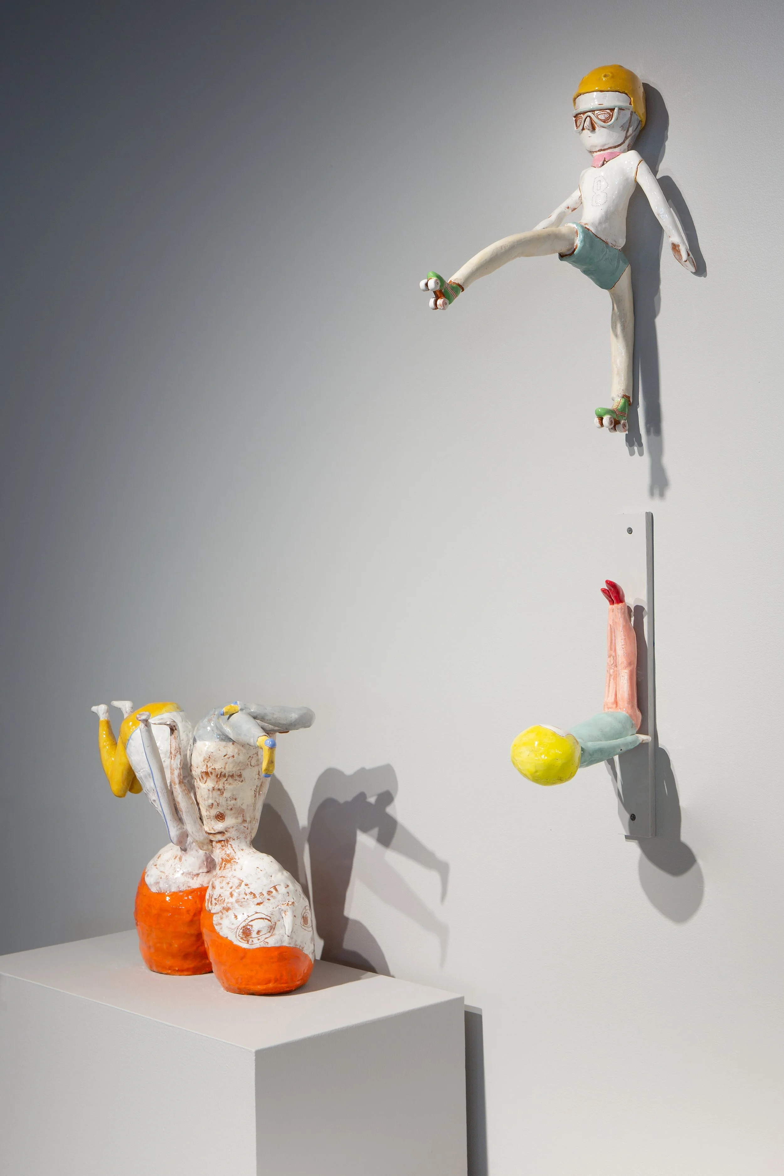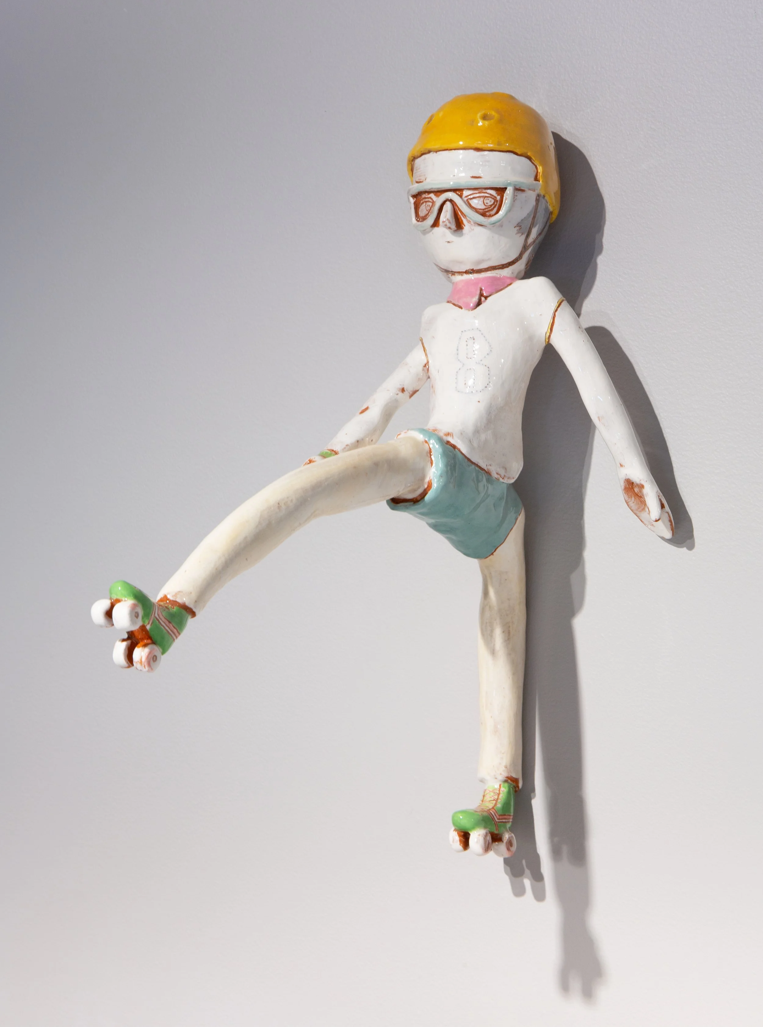 Rollerskater. 17" x 5" x 14" Earthenware, slip, underglaze, glaze.
