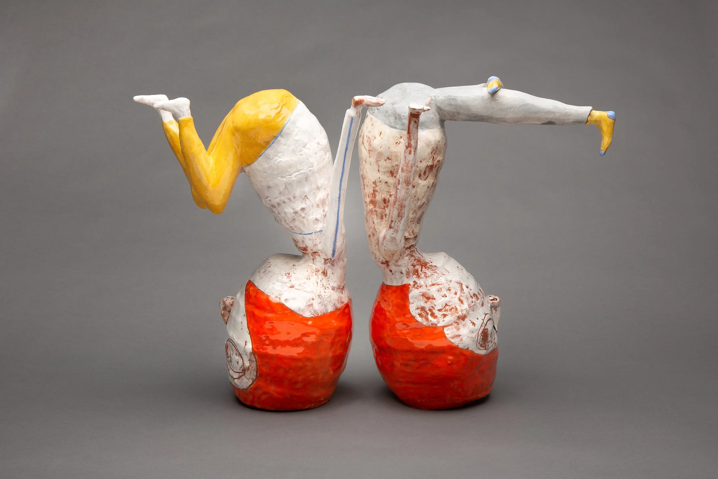 Up and Down. 27" x 16" x 12" Earthenware, slip, underglaze, glaze.