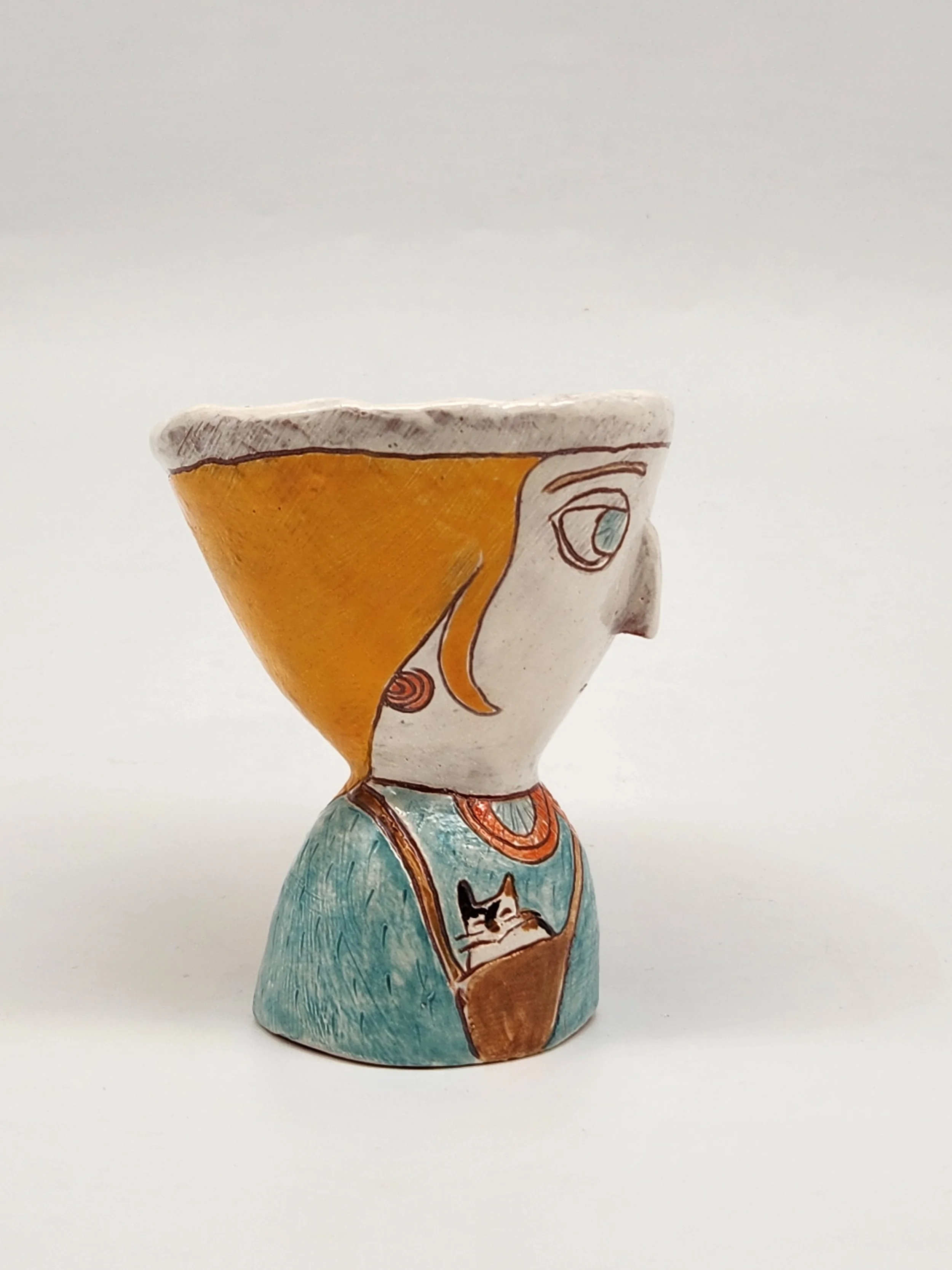 Sheena, the botanist, in her stressless oasis. 14" x 11" x 5.5" Earthenware, slip, underglaze, glaze, succulents.